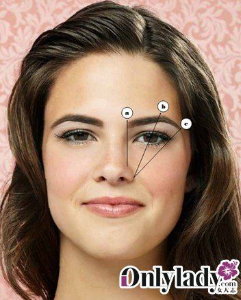 拿一只铅笔,将它的一端靠在鼻翼上的凹陷处,铅笔竖直,铅笔与眉毛的交集位置,就是A点,即眉毛的最佳起点。接下来,把笔的一端放置在鼻翼最外侧的位置,笔向着瞳孔中心的方向,铅笔与眉毛的交点就是B点,即最佳眉峰位置。最后,用铅笔连接鼻翼和眼尾,延伸到眉毛处就是C点,即最佳眉尾处。找准ABC,基本上就能修一个合格的眉毛