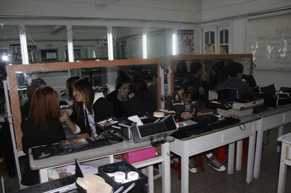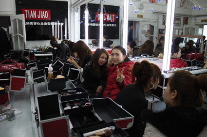 随着学员的迅速增加,天娇学校的教室显得越来越“挤”了。特别是练妆的时候,桌子被散乱地摆放在一起,学员在整个教室的四周化妆镜台前铺开,好大的场面!要想从中穿行,还真有些困难呢。