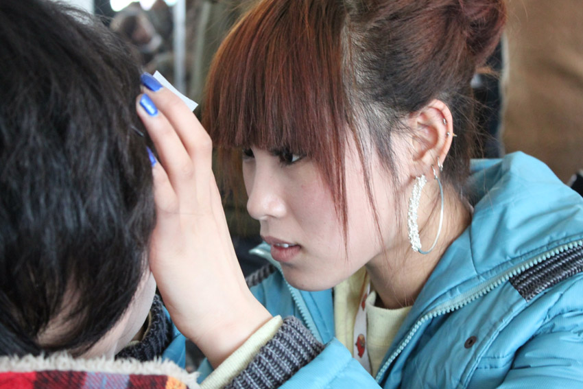 化妆活动从中午12点开始,一直进行到下午13点20分。天娇学员们将他们在学校所学的各种化妆技巧用出来,认真观察化妆对象的脸型和肤色,然后根据其特点打粉底、画眼影、描眼线、抹腮红、修眉毛,用尽各种化妆技术力求把自己服务的对象的脸部瑕疵尽量掩盖、靓点特别突出。