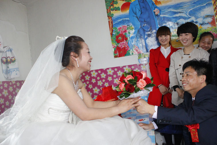 一大早大家就做崔校长的车出发,直奔泰康。经过一个小时的颠簸到达,天还没亮呢。化妆师和摄影师各就各位,紧张地忙碌起来。两名化妆师分别为新娘化妆、做造型,摄影师则用镜头记录下一个个喜庆的场面。接亲、献花、找鞋、抓宝、送到酒店,斟香槟、换戒指等等,都被摄影师记录了下了。