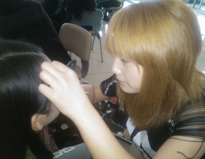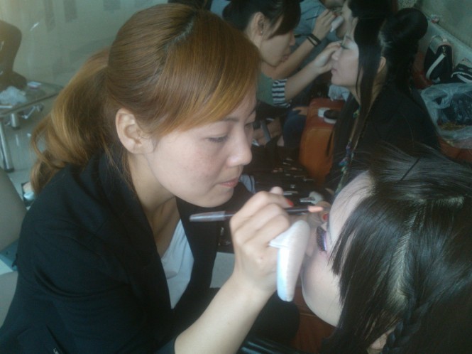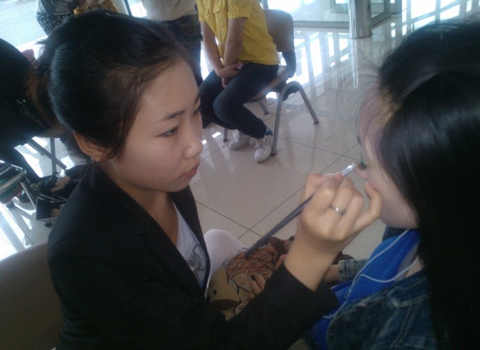 天娇学校学员刘晓慧为演员化妆