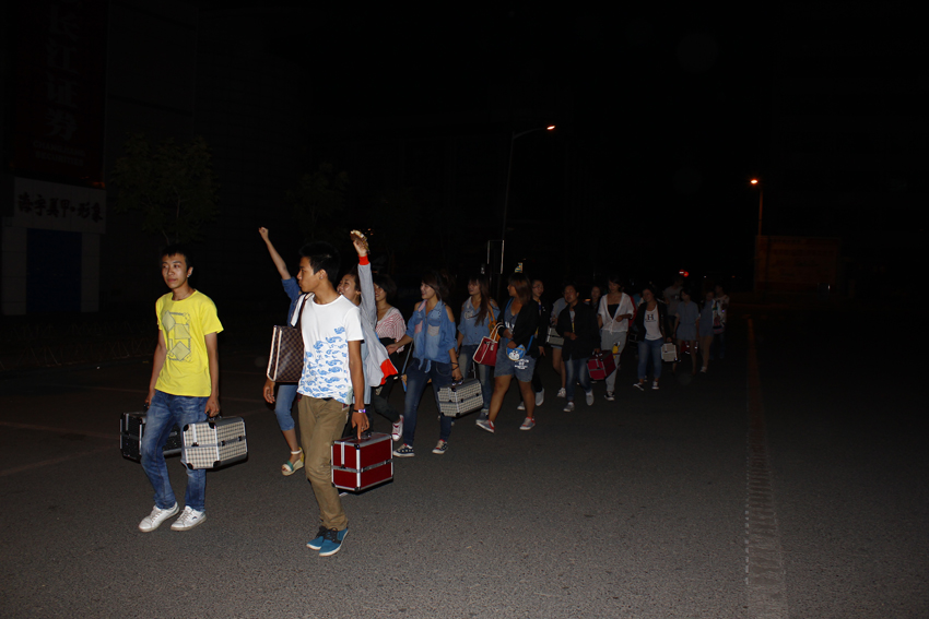 早晨3:00,天娇学校的教室里已经灯火辉煌,老师和各位小化妆师们都早已来到学校,等待集体出发,奔赴大金山国宴楼的化妆场地。人员到齐后,全体整队出发。天还黑蒙蒙的,星星仿佛也正在沉睡中,但同学们的兴致却都很高,虽然这么早起床大家都不习惯,不太舒服,但一想到今天的活动,都兴高采烈地边走边谈论着。