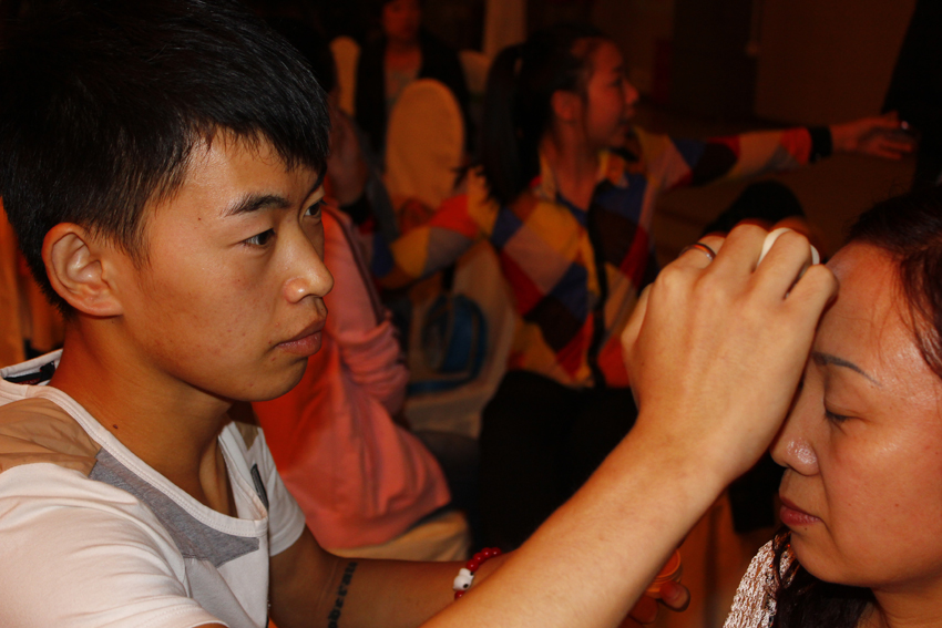 看到一对对皮肤或粗糙或细腻,颜色或黑或白的对对新人,同学们没有犹豫或惧怕,运用老师教过的各种化妆技法迅速化起妆来。现场由于人多,显得有些忙乱,我们的校长和老师也忙碌地调度着化妆师们,让整个化妆活动一直迅速而有序地进行。由于俄罗斯、韩国、日本、非洲等外籍新人也较多,我们的化妆师和他们语言不通,而现场翻译又不太多,所以同学们尽量和自己的化妆对象用简单的英语甚至手势来交流,力求满足客人的个性化化妆要求,为近100对新人化妆,竟然没有发生一例口角或客人不满意情况,也可以看出同学们扎实的化妆基本功和优秀的服务水平。